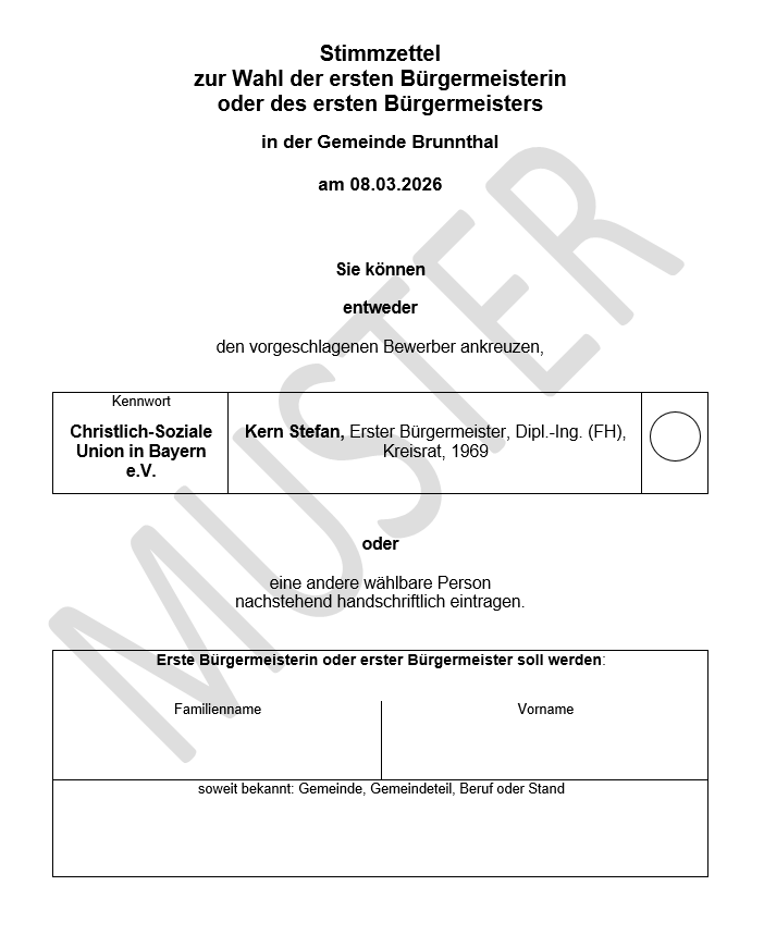 Da nur ein Kandidat (Wahlvorschlag) für die Bürgermeisterwahl benannt ist, ist es erlaubt, jeden deutschen Staatsbürger und jede deutsche Staatsbürgerin, der oder die mindestens 18 Jahre alt ist, auf dem Stimmzettel in den dafür vorgesehenen Feldern handschriftlich einzutragen und somit als Ersten Bürgermeister oder Erste Bürgermeisterin zu wählen.