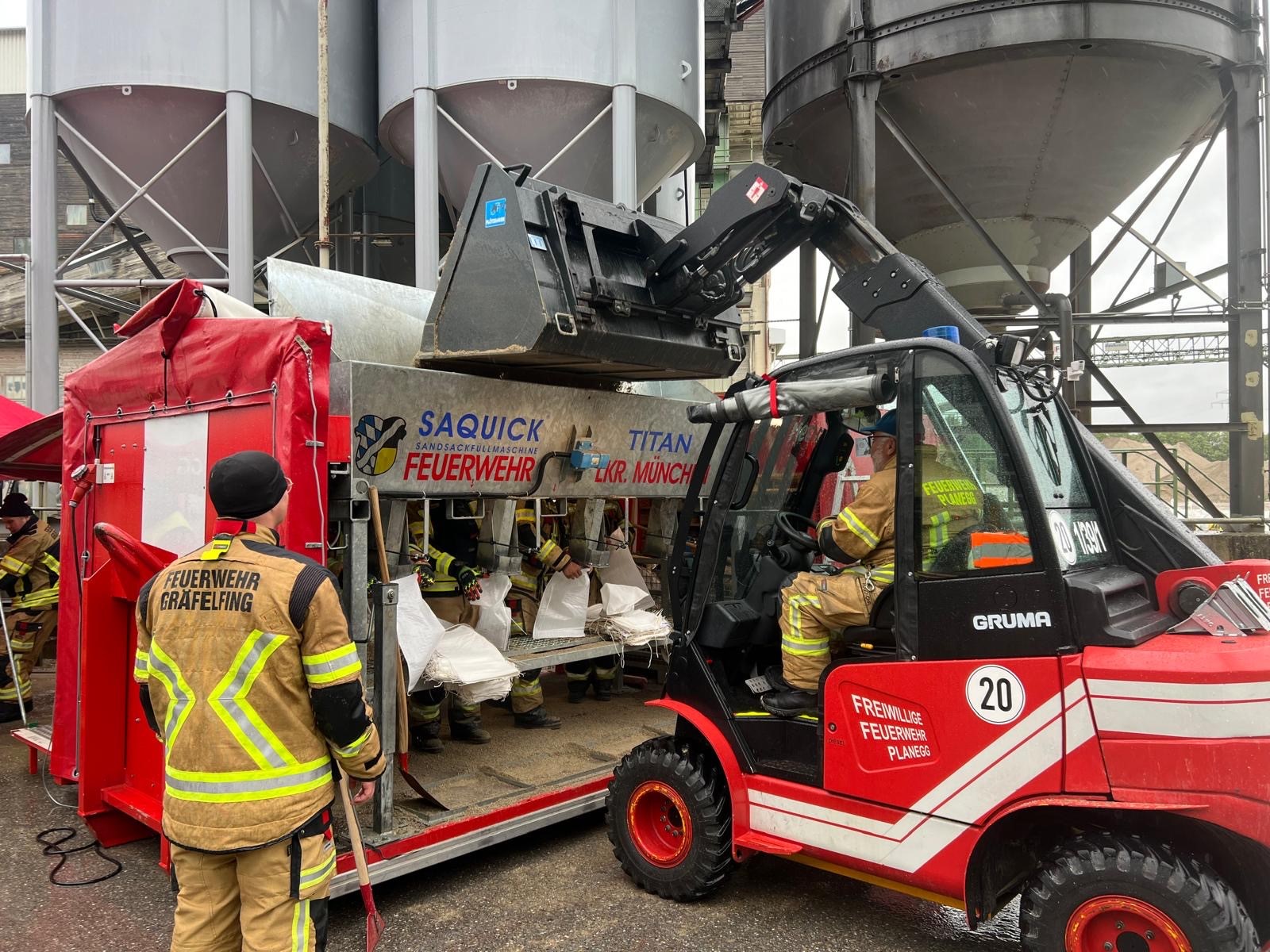 Im Lauf des Tages wurde in einem im Kreis ansässigen Kieswerk mithilfe der Landkreisfeuerwehren eine Abfüllanlage für Sandsäcke in Betrieb genommen und die Sandsäcke im Anschluss über die Feuerwehren im Landkreis verteilt.