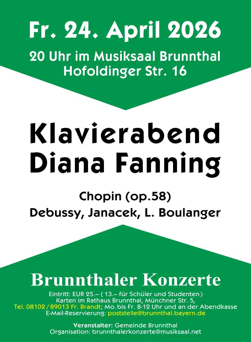 Die Pianistin Diana Fanning konzertiert als Solistin und Kammermusikerin regelmäßig in vielen Ländern der USA und in England, Frankreich, Österreich, den Niederlanden, Tschechien und Deutschland. In den vergangenen Jahren trat sie im Schloss Leopoldskron in Salzburg und auf Einladung der Internationalen Dvorak-Gesellschaft in Prag auf. Mehrmals ist sie im Musiksaal Brunnthal zu hören gewesen. Diana Fannings CD mit Werken von Janáček, Chopin und Debussy wurde von der Kritik in England und den USA begeistert besprochen. Sie ist als Klavierdozentin am Middlebury College in Vermont (USA) tätig.